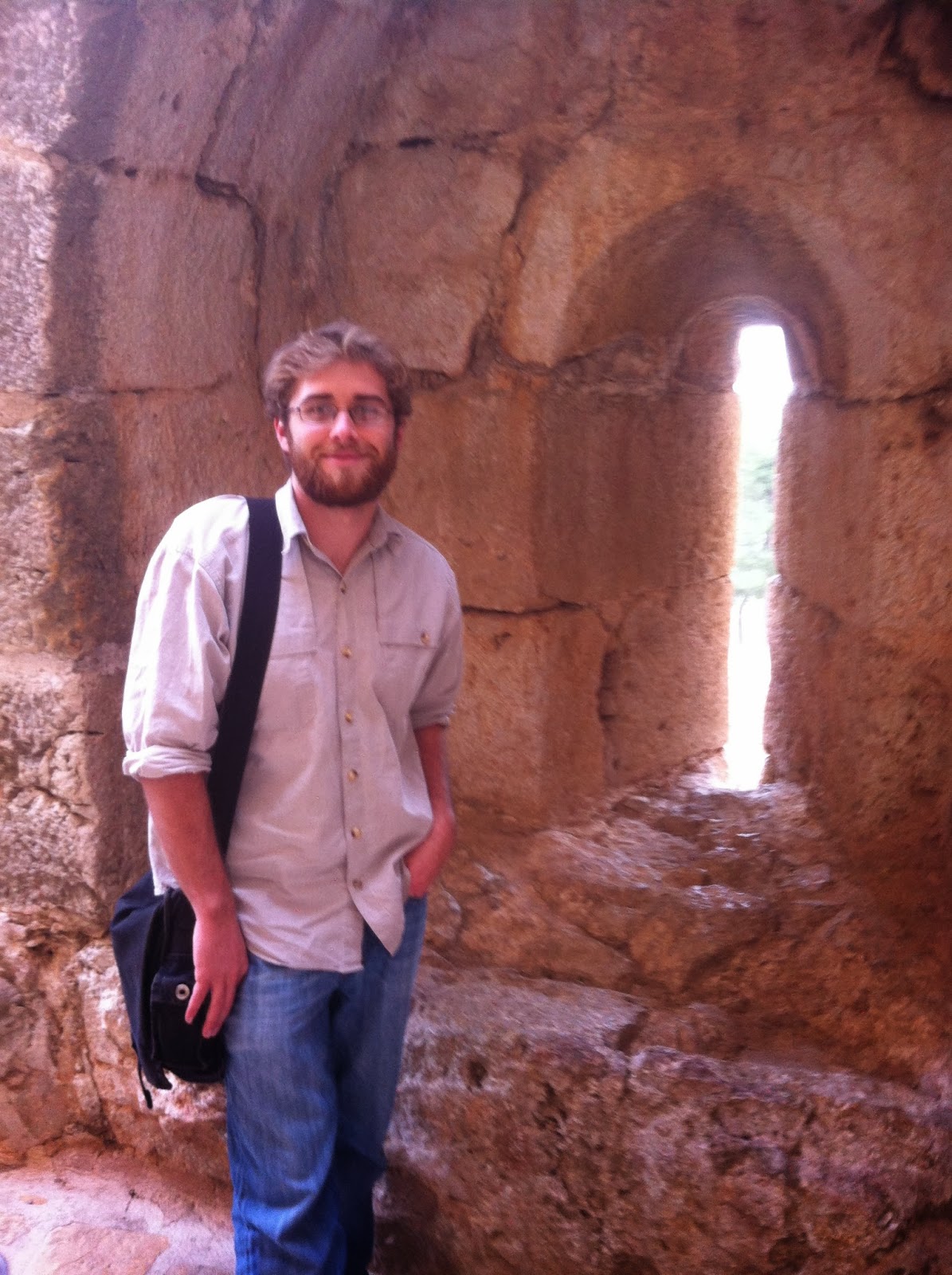 Sorry for the hiatus -- our internet is so terrible we can barely check email, and blogger apparently requires a lot of bandwidth or whatever. Anyway, I think 3 weekends ago we took a little day trip to one of Jordan's historic Northern towns, Ajloun. I think we intended to do more exploring, but the 12th c. castle was so amazing we ended up spending the whole afternoon there. Unlike in the US or Europe, there were no rules, no monitoring, no roped off sections or "no entry" signs; everything was open for walking around, leaning over, sitting on or even climbing on. It was spectacularly beautiful (we both commented how ironic it was that often the most beautiful ancient ruins were those originally built for the purpose of war), and the view from the top was insane. We were told we were looking all the way across Palestine to Lebanon. To top it off, it had drizzled while were inside the castle, and when we got to the roof there was a huge rainbow in perfect view. What does it mean!?!?